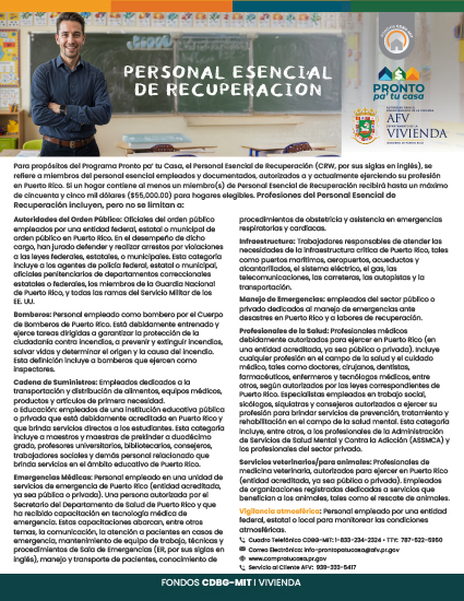 • Hasta un máximo de $55,000.00 por cada hogar elegible de Ingresos Bajos y Moderados (LMI) o de Necesidad Urgente (UN) con al menos un miembro que pertenezca al Personal Esencial de Recuperación (ver listado).