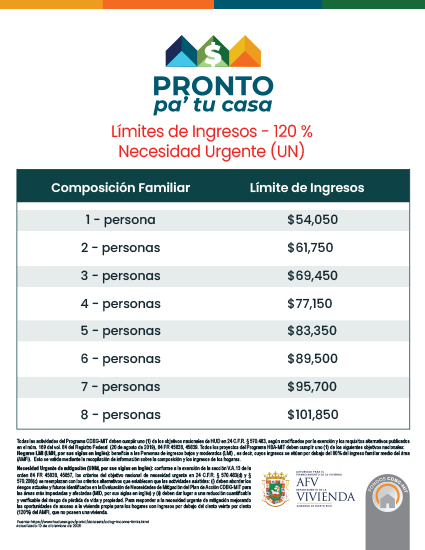 *Los Objetivos Nacionales del Programa Pronto pa’tu casa son los siguientes: Ingresos Bajos y Moderados (LMI): Beneficiar a las familias de ingresos bajos y moderados, según se define en los límites de ingresos modificados de HUD para Puerto Rico bajo el programa CDBG-MIT. Necesidad Urgente (UN): Satisfacer la necesidad urgente de reducir la emigración causada por los huracanes con el fin de mantener la sostenibilidad y la viabilidad económica de las comunidades de Puerto Rico, al mejorar las oportunidades de las familias que están por debajo del ciento veinte por ciento (120%) del ingreso familiar promedio del área (AMFI) para convertirse en propietarios de viviendas. La Política de la FHA, según definida en su Manual de Política de Vivienda Unifamiliar 4000.1 (“Single-Family Policy Handbook 4000.1”), establece que un programa de vivienda asequible “debe servir a las personas o familias de ingresos bajos a moderados. Personas o familias de Ingresos Bajos a Moderados se refiere a personas o familias cuyo ingreso del hogar no excede el 115 por ciento (115%) del ingreso medio para el área al ajustarlo al tamaño familiar.